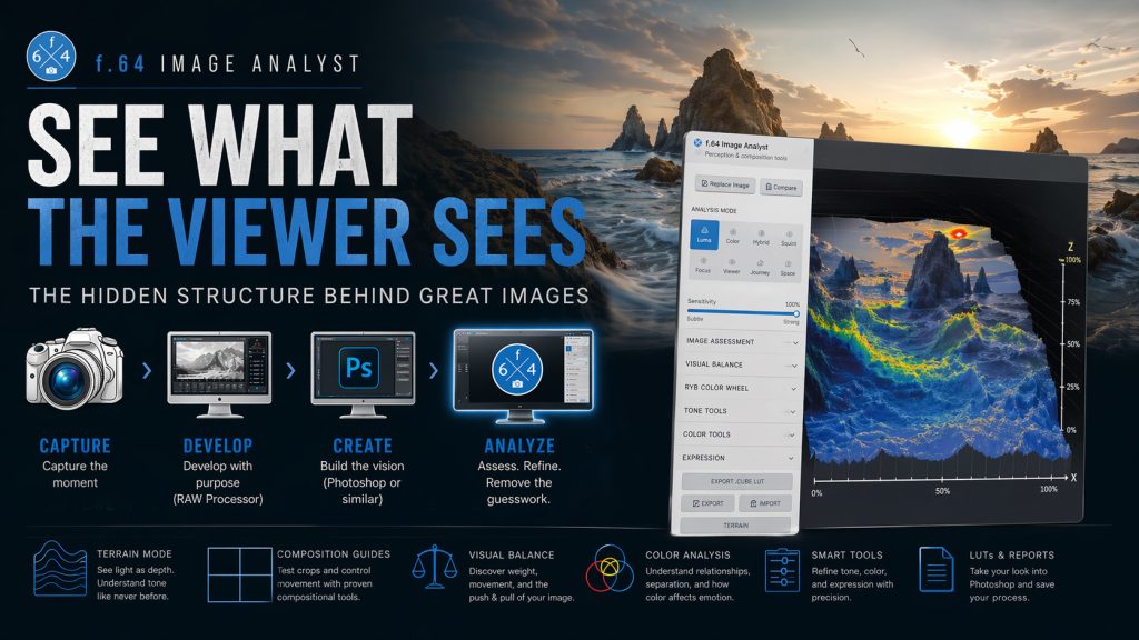 The f.64 Image Analyst was built to help answer that question. It’s not an AI tool, and it’s not a slammer-sliding guessing game either. It’s built on math to help you see how tone, color, and composition work together to guide the viewer’s eye. In this course, you’ll learn how to use the Analyst as a finishing and assessment tool so you can remove the guesswork from your work and start seeing your images the way your viewer does.